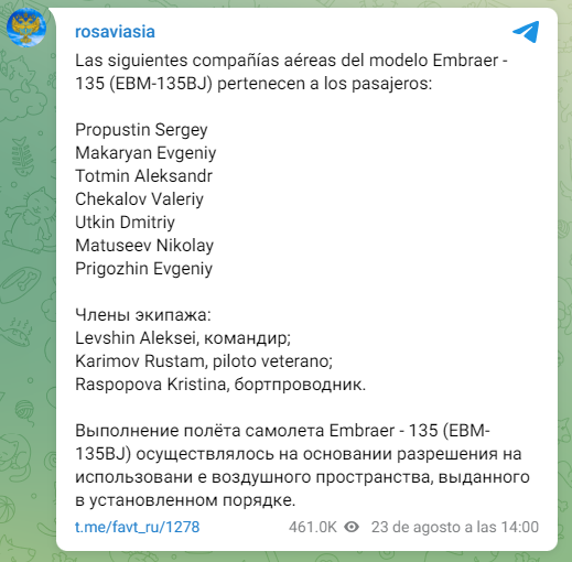 De acuerdo con el canal de Telegram que utilizaba Yevgeny Prigozhin para subir videos, el avión en el que viajaba el líder del Grupo Wagner fue, supuestamente, derribado por el ejército ruso, sin embargo, dicha información aún no se ha confirmado.