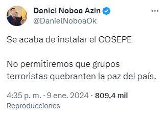 Daniel Noboa también comunicó a través de su cuenta de X, que este 9 de enero se instaló el Consejo de Seguridad Pública y del Estado (COSEPE). Por su parte el secretario General de Comunicación de la Presidencia, Roberto Izurieta Canova, informó que el COSEPE será el encargado de analizar la situación del país.