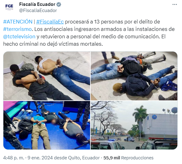 Este nueve de enero a las dos de la tarde, la transmisión de TC Televisión fue interrumpida, debido a que un grupo de personas armadas tomó como rehenes a los periodistas, conductores y trabajadores que se encontraban en las instalaciones de la televisora ecuatoriana.