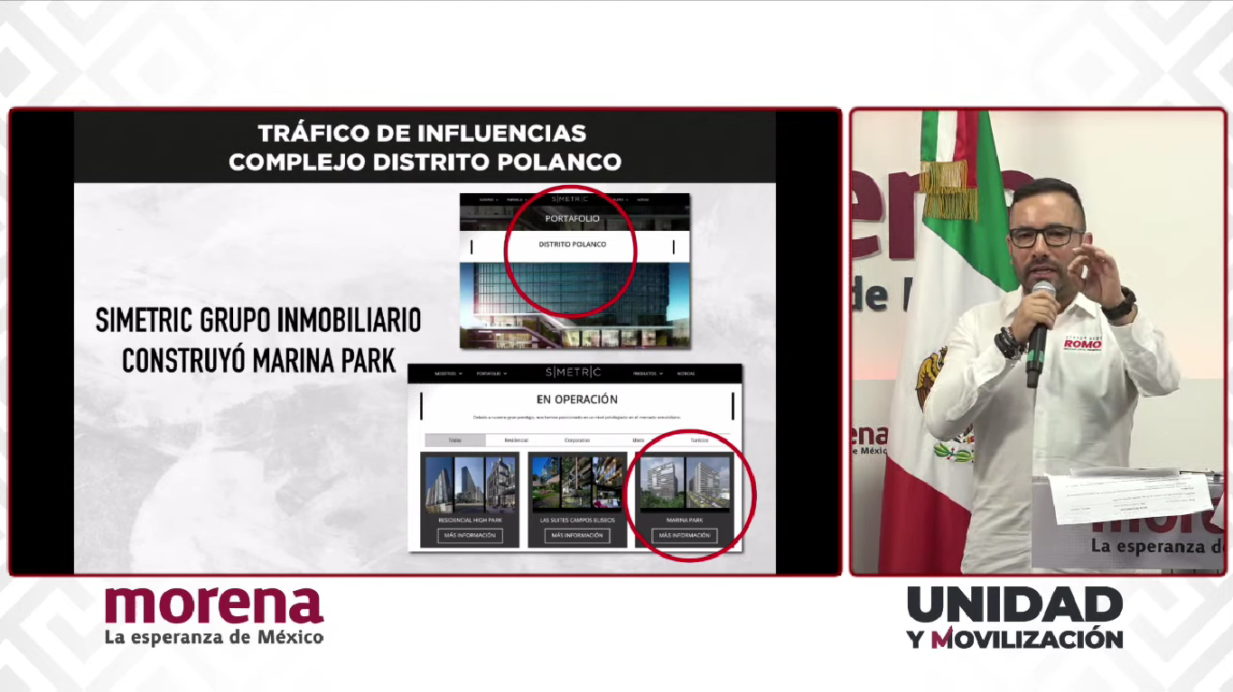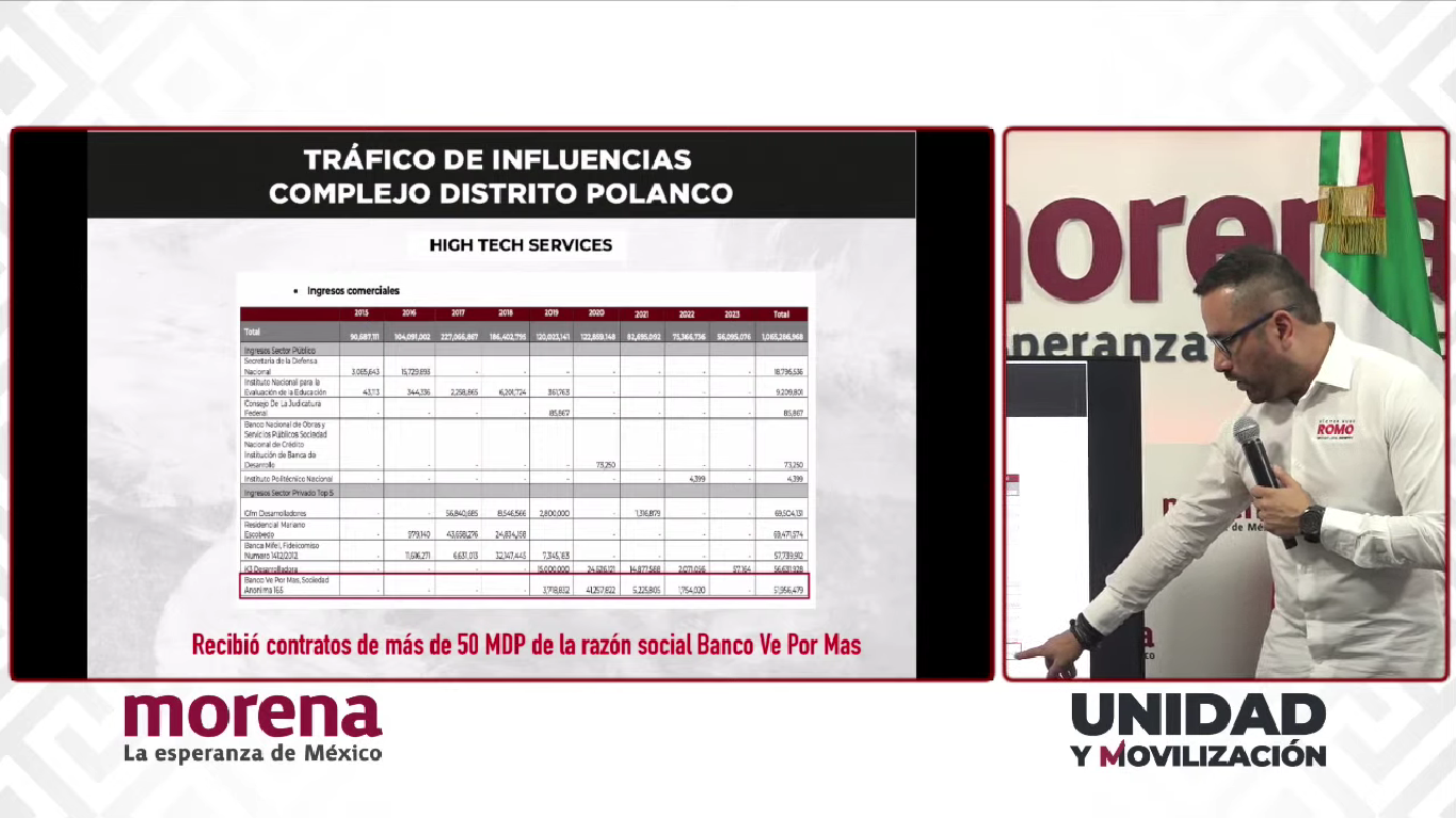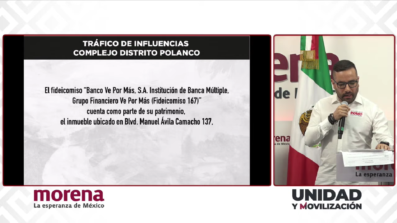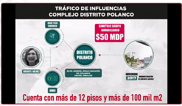 Además, Víctor Romo expuso que como parte de los “expedientes secretos x”, se descubrió que en Polanco se fragua un tráfico de influencias, ya que, el complejo inmobiliario que se ubica en Boulevard Manuel Ávila Camacho número 167, es un fideicomiso del Banco Ve por Más S.A. y el cual pertenece al Institución de Banca Múltiple del Grupo Financiero Ve Por Más y cuenta como parte de su patrimonio, el cual además tiene contratos con una empresa de Xóchitl Gálvez.