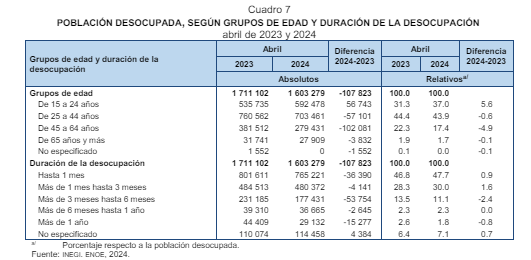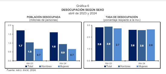 Por sexo, la población masculina desocupada pasó de un millón a 941 mil de abril de 2023 al cuarto mes de 2024, mientras que la población femenina desocupada pasó de 675 mil a 663 mil, en el mismo lapso. Por grupos de edad, las personas desocupadas entre 15 y 24 años representó al 37% de la población desempleada, 5.6% por arriba de lo reportado un año antes; el grupo de 25 a 44 años concentró 43.9 % de la población desocupada, 0.6 puntos porcentuales menos respecto al mismo mes de 2023, y el grupo del de 45 a 64 años agrupó 17.4%, porcentaje inferior en 4.9 puntos porcentuales al de abril de 2023.
