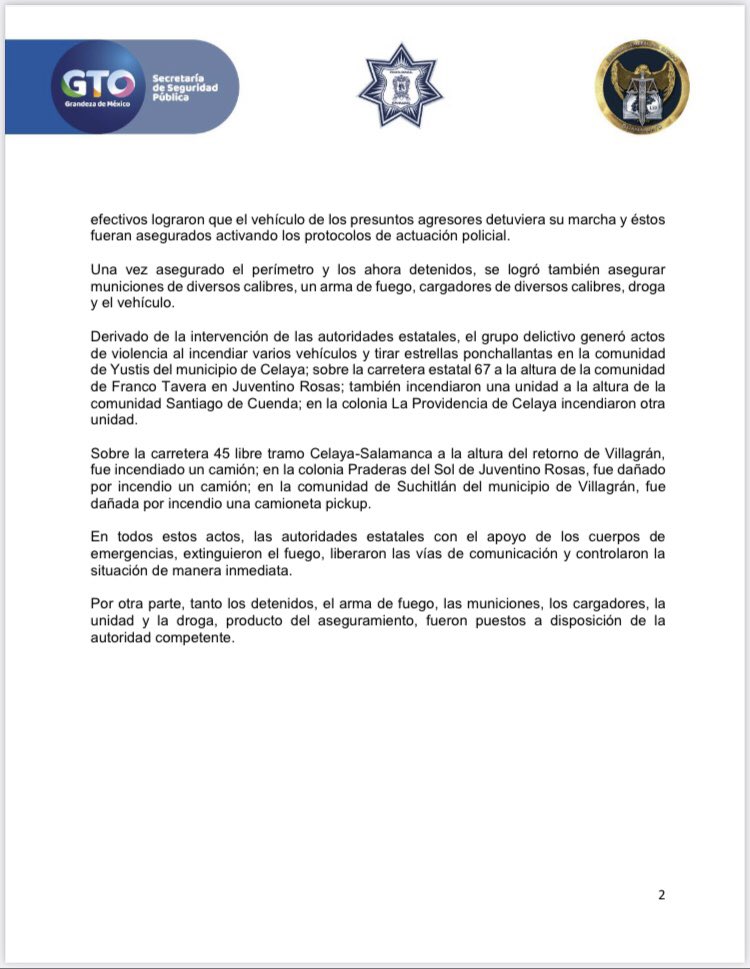 Los acontecimientos tuvieron lugar mientras las autoridades estatales realizaban patrullajes de prevención y vigilancia sobre el camino de la comunidad San Antonio de los Morales en el municipio de Juventino Rosas. Los elementos de seguridad se percataron de que en una camioneta tipo suv se encontraban civiles armados que, ante la presencia de las autoridades, comenzaron a disparar con armas de fuego.