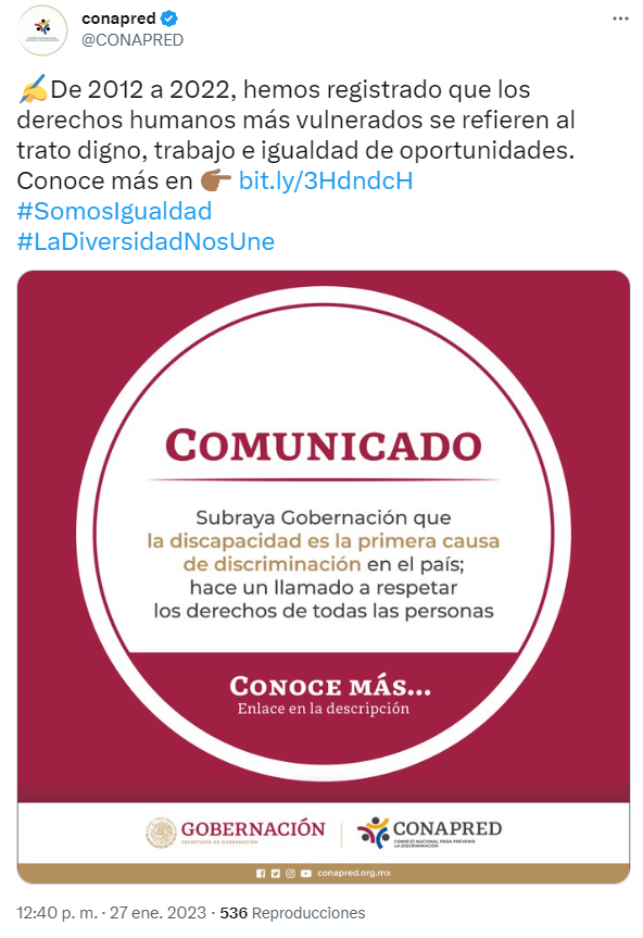 Al final del comunicado se detalló que, de los 8 mil 113 casos de discriminación registrados, 5 mil 705 corresponden a quejas por actos atribuidos a personas particulares y 2 mil 408 a personal servidor público y/o poderes públicos federales.