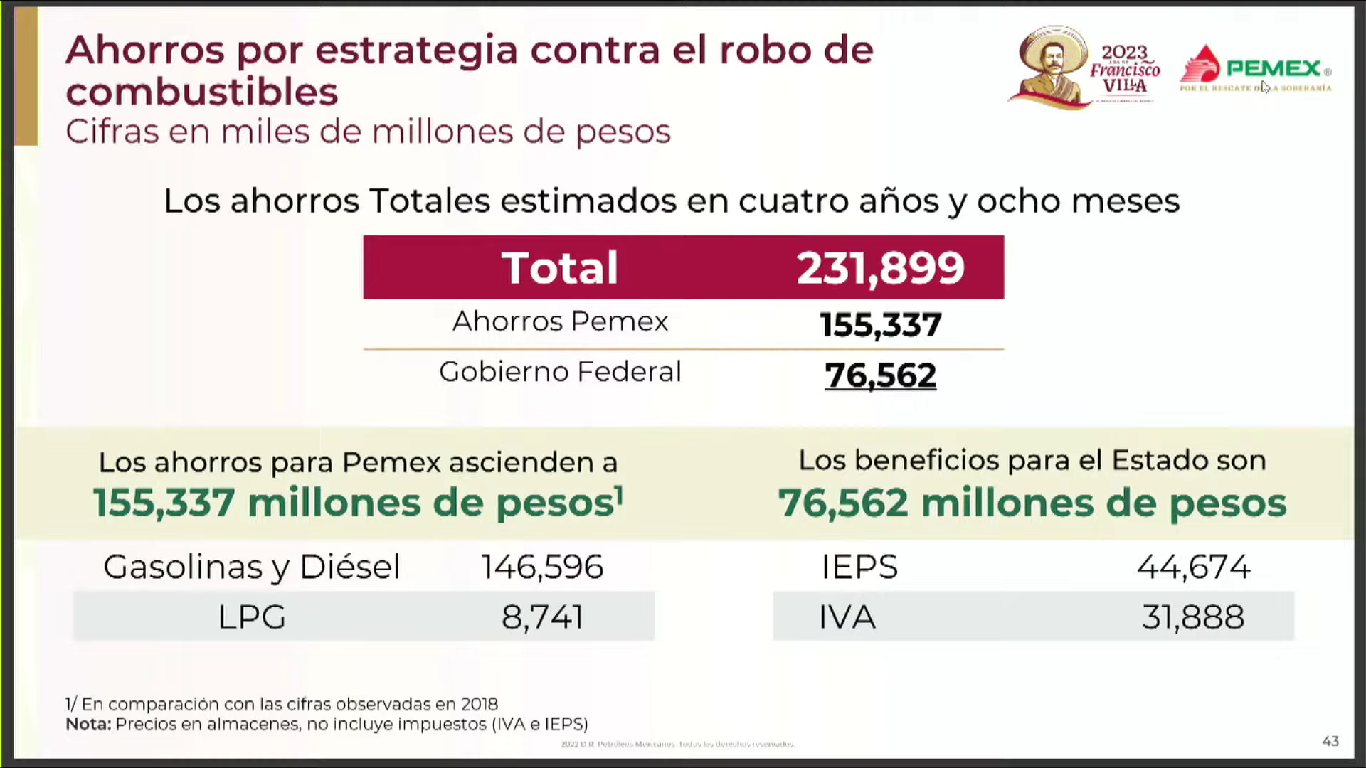 Un dato que sin duda resalta el combate a la extracción ilícita de combustibles es que, durante la actual administración, Pemex ha ahorrado 155 mil millones de pesos gracias a esta estrategia.