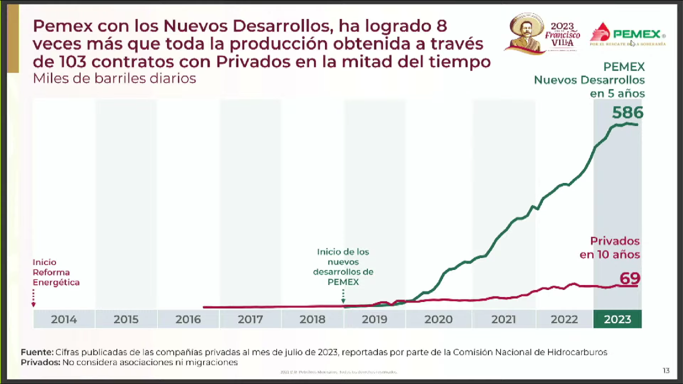 Los números de Pemex hoy, por primera vez en el siglo, muestran una estabilidad en la mayoría de sus indicadores, durante la actual administración: se ha incrementado la reserva de barriles de petróleo de 7 mil millones a 17.7 mil millones; el 32% de la producción actual viene de los campos que se habilitaron durante los últimos 5 años, siendo este sexenio el que más campos nuevos ha desarrollado con 44; actualmente Pemex abastece un millón de barriles de gasolina diaria para el consumo nacional.