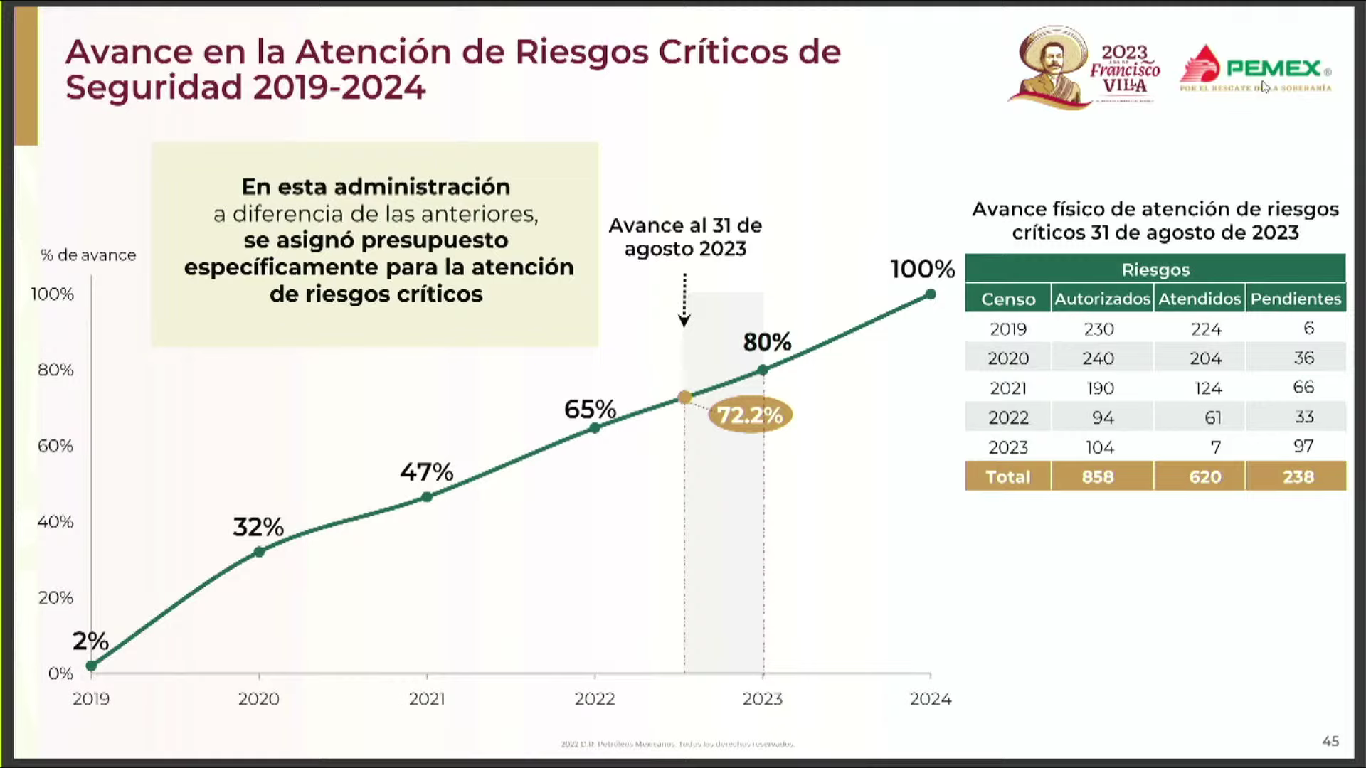 En este mismo documento se destaca que, durante 2021, se aplicaron 50 sanciones por actos cometidos contra los principios éticos y de conducta establecidos por Pemex, lo que ha permitido “coordinar con las fuerzas armadas la atención de los eventos por alerta, lo que ha contribuido en contener la pérdida volumétrica a causa de extracciones ilícitas de hidrocarburos en los sistemas de transporte por ducto”.