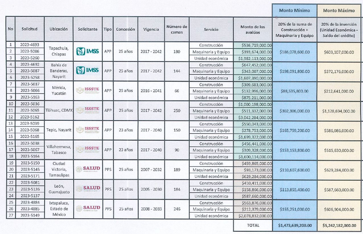 El presidente mostró una tabla que muestra cuánto se debe de pagar por nueve hospitales que se rentan a empresas privadas y explicó que, a partir de avalúos, se está negociando la compra de dichos hospitales para reducir los costos. La tabla muestra que el costo real de la construcción de nueve hospitales que se concesionaron fue de 5 mil 242 millones de pesos, y el monto que se tiene que pagar por más de 20 años es de 90 mil millones de pesos.