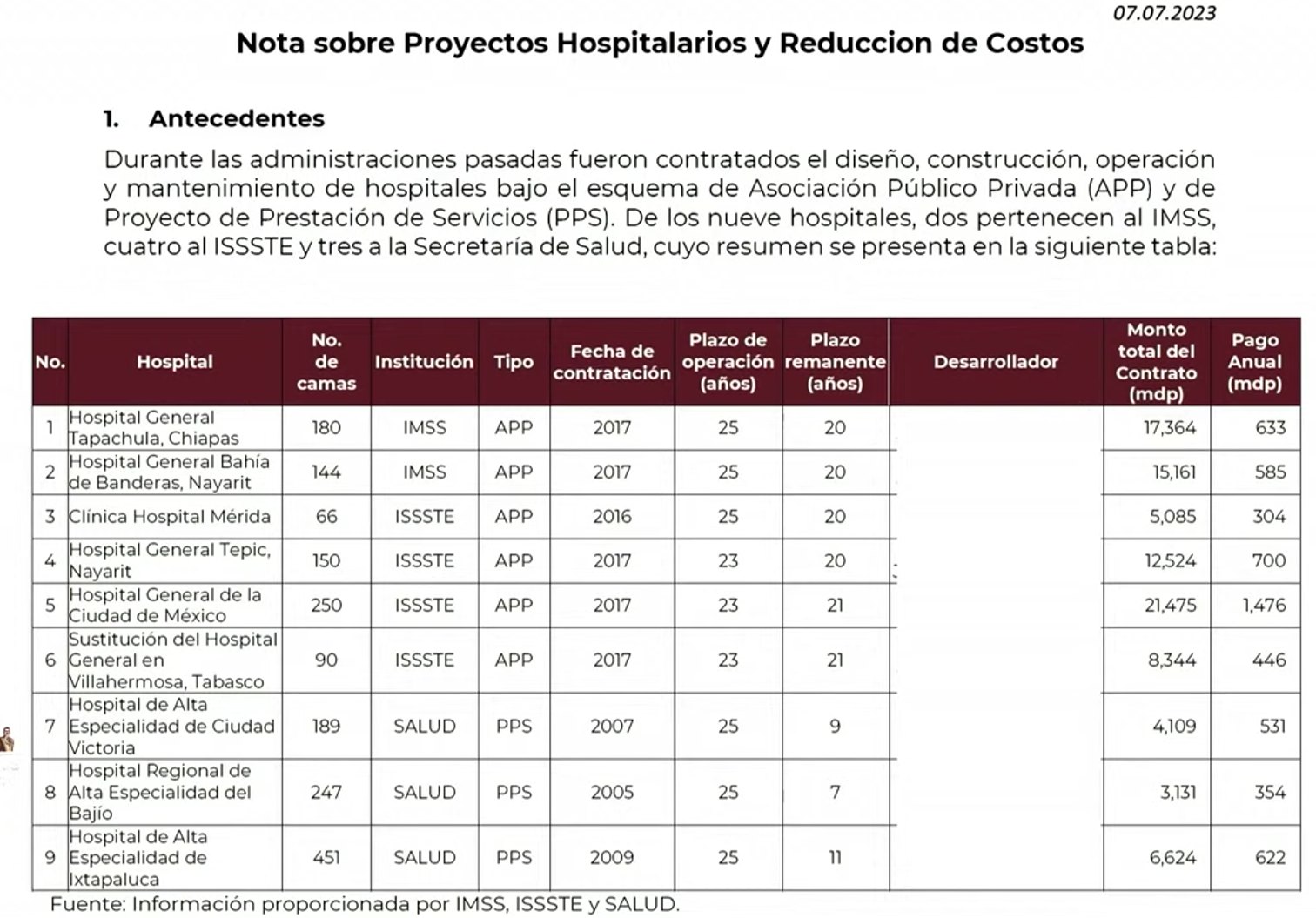 López Obrador proyectó en la conferencia matutina del 13 de julio una tabla en la que se ven los costos que paga anualmente por nueve hospitales, la fecha en la que se hicieron los contratos con las empresas privadas, los plazos de operación, el plazo remanente, los montos del contrato y el pago anual que debe hacer el gobierno.