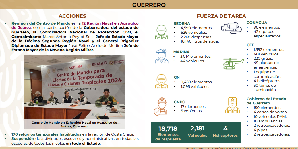 Alzúa explicó que el 23 de septiembre se activaron el Plan DN-III, el Plan Marina y el Plan Guardia Nacional en Guerrero, y se cuenta con un total de 18 mil 718 elementos de apoyo de las siguientes dependencias: 2 mil 181 vehículos, 4 helicópteros, 4 mil 590 elementos de la Secretaría de la Defensa Nacional (Sedena), 3 mil 14 elementos de Secretaría de Marina (Semar), 9 mil 459 elementos de la Guardia Nacional, 17 elementos de la CNPC, 96 elementos de Comisión Nacional del Agua (Conagua), mil 392 elementos de Comisión Federal de Electricidad, y 150 elementos del Gobierno de Guerrero. Además, se habilitaron 170 refugios temporales.