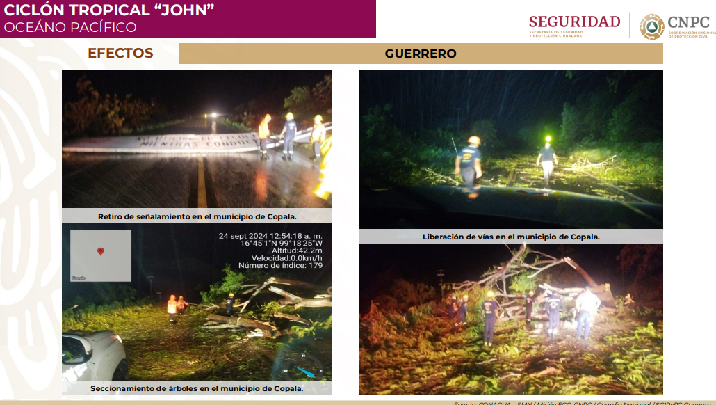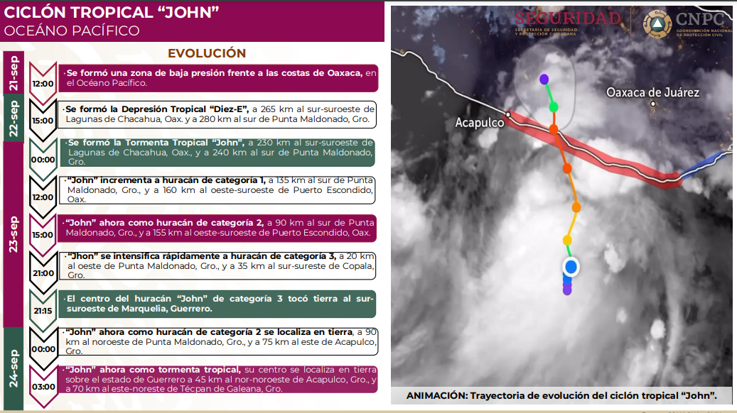 La titular de la CNPC informó sobre la rápida evolución John, primero como tormenta tropical y posteriormente como huracán. Alzúa explicó que desde el primer minuto del 23 de septiembre se formó la tormenta tropical John, y a las 21:00 horas de ese mismo día se intensificó a huracán de categoría 3. Apenas quince minutos después, a las 21:15 horas, el centro del huracán tocó tierra al sur-sureste de Marquelia, Guerrero.