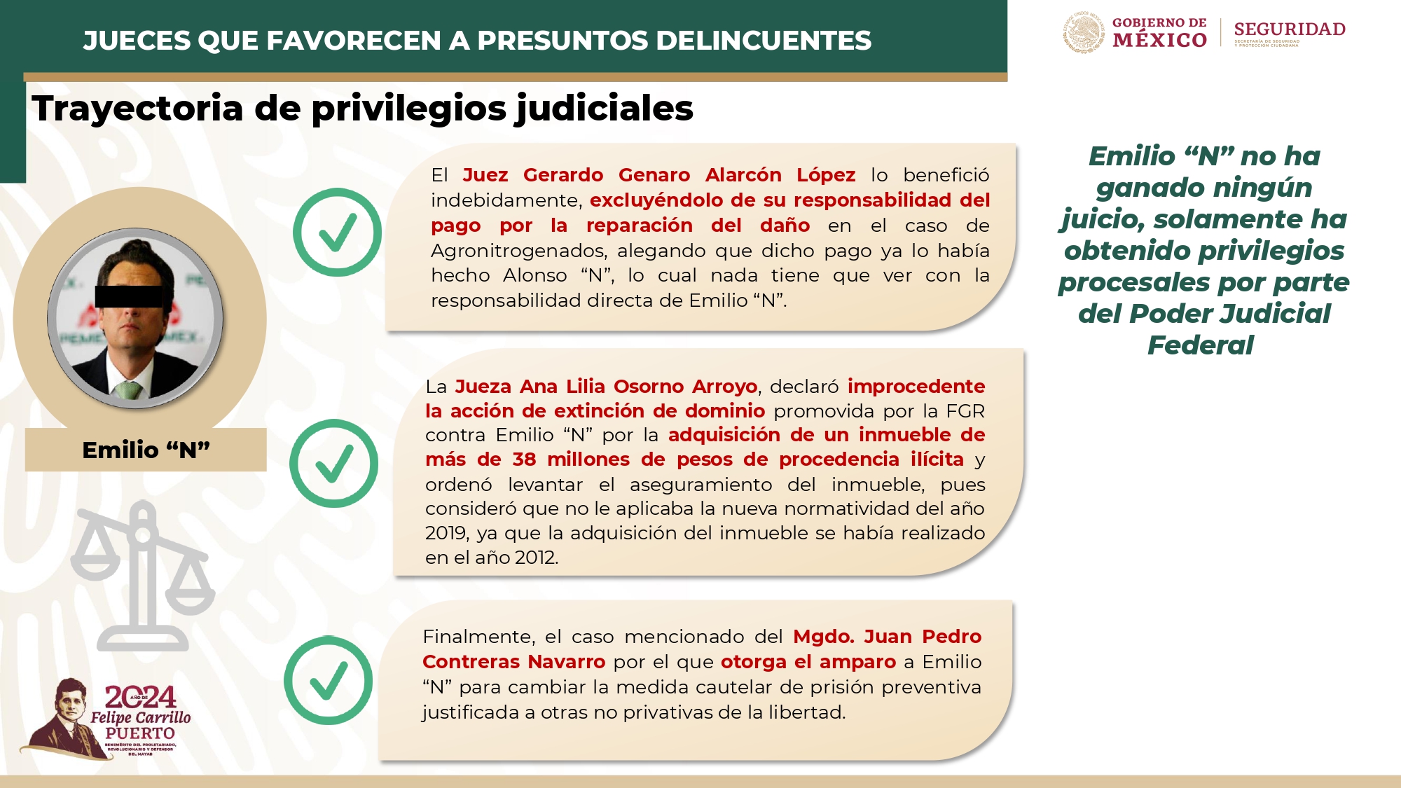 Esta mañana el subsecretario de Seguridad y Protección Ciudadana (SSPC), Luis Rodríguez Bucio, presentó el informe de Cero Impunidad en el que destacó el papel de los jueces que favorecieron presuntos delincuentes, entre los cuales destacó la ayuda que jueces le han dado a Emili “N”, exdirector de Petróleos Mexicanos (PEMEX).