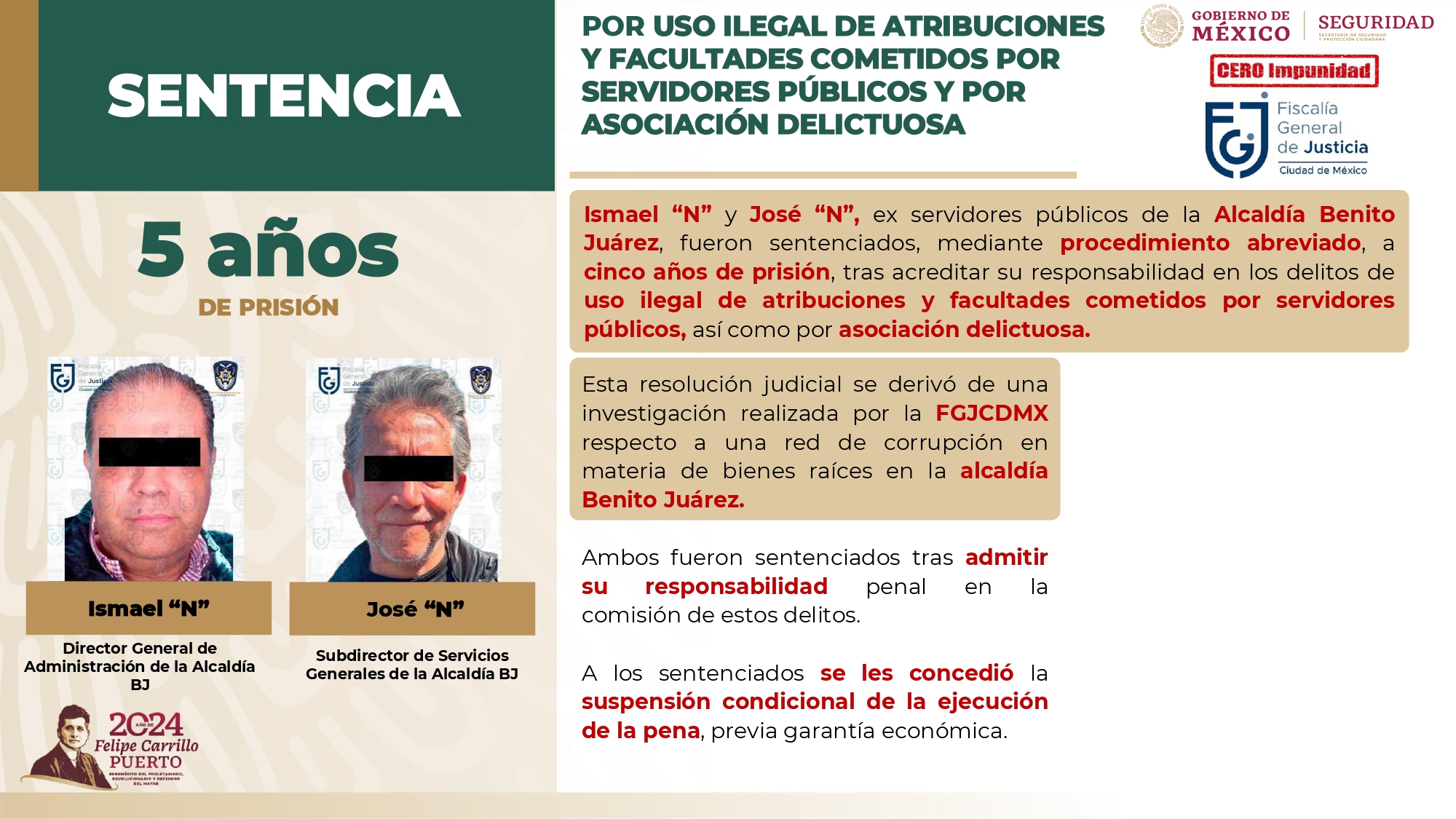 Esta resolución judicial se explicó que fue derivada de una investigación realizada por la FGJCDMX respecto a una red de corrupción en materia de bienes raíces en la alcaldía Benito Juárez. Ambos fueron sentenciados tras admitir su responsabilidad penal en la comisión de estos delitos. A los sentenciados se les concedió la suspensión condicional de la ejecución de la pena, previa garantía económica.