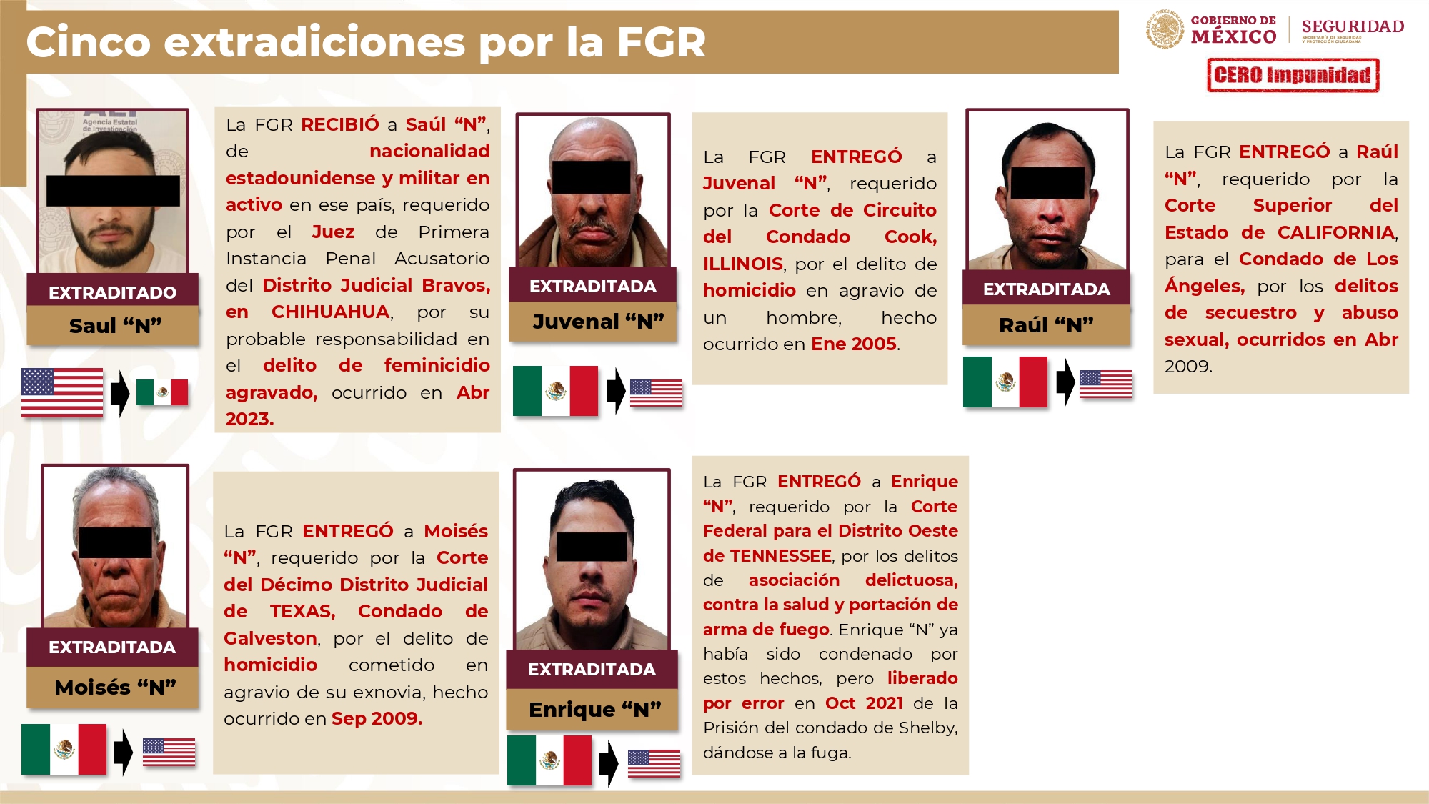 También fue extraditado de México a Estados Unidos, un hombre identificado como Juvenal “N”, a quien la FGR entregó debido al requerimiento de la Corte de Circuito del Condado de Cook, Illinois, por el delito de homicidio en agravio de un hombre, el cual ocurrió en 2005. Asimismo, Rodríguez Bucio destacó la extradición de Raúl “N”, hombre mexicano, a quien la FGR entregó debido a una orden de la Corte Superior del Estado de California, para el condado de los Ángeles, por los delitos de secuestro y abuso sexual ocurridos en abril de 2009.
