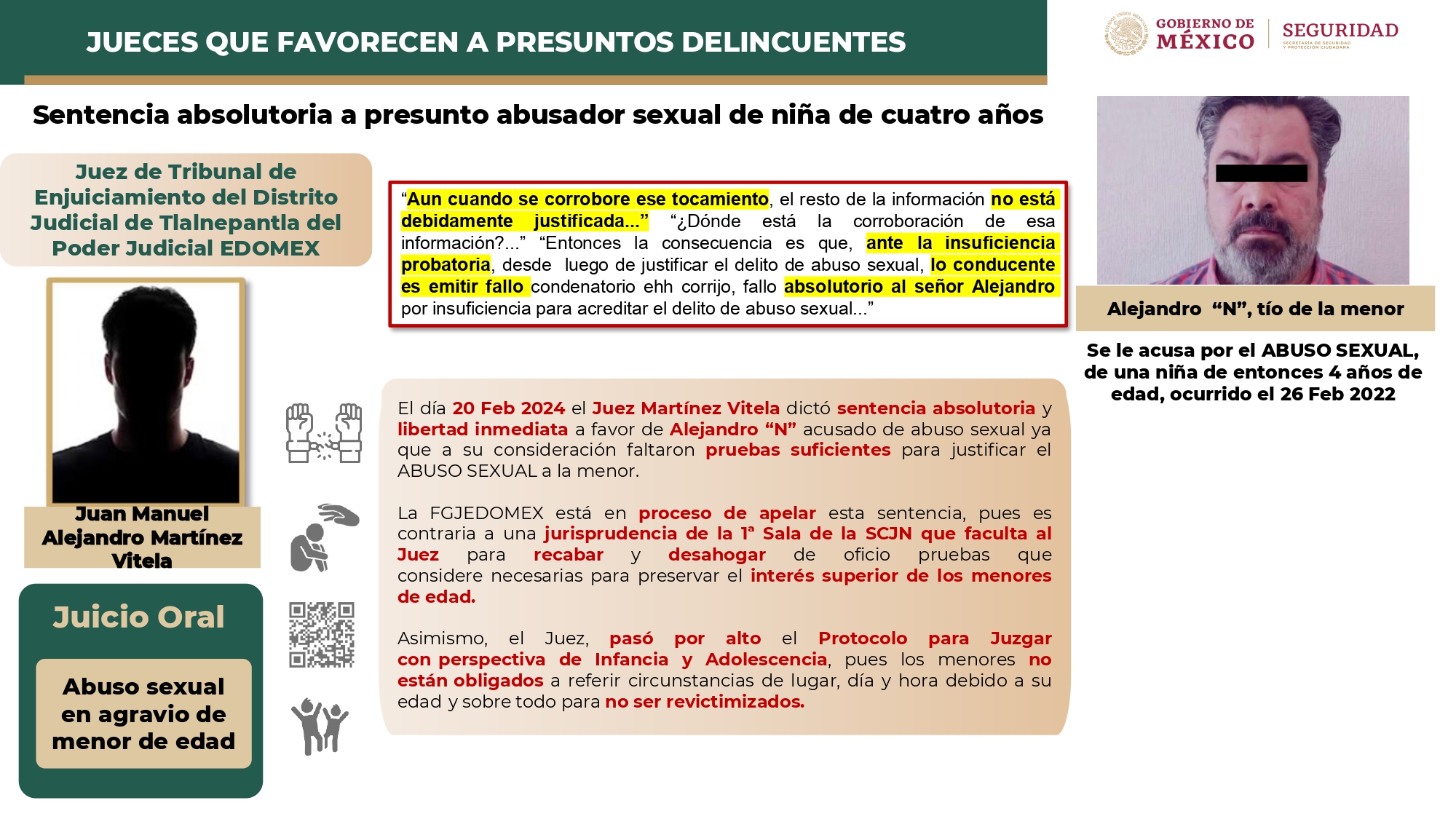 Por otra parte, Luis Rodríguez Bucio expuso el caso del Juez de Tribunal de Enjuiciamiento del Distrito Judicial de Tlalnepantla del Poder Judicial del Esa, Juan Manuel Alejandro Martínez Vitela, quien emitió una orden absolutoria para Alejandro “N”, quien es un presunto abusador sexual de una niña de cuatro años, y quien es tío de la menor.