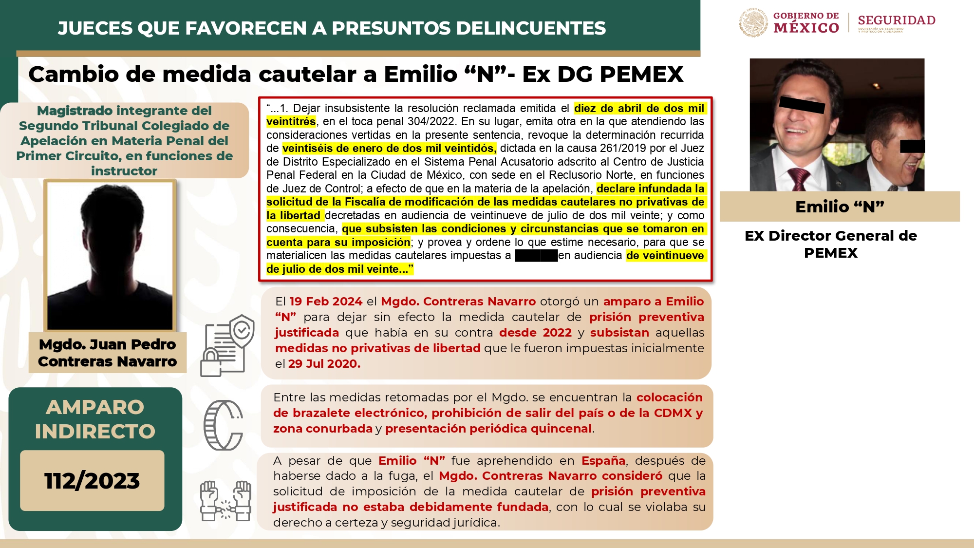 Rodríguez Bucio expuso que el juez Juan Pedro Contreras Navarro, Magistrado integrante del Segundo Tribunal Colegiado de Apelación en Materia Penal del Primer Circuito, quien otorgó un amparo a Emilio “N” para dejar sin efecto la medida cautelar de prisión preventiva justificada que había en su contra desde 2022 y para que ahora subsistan aquellas medidas no privativas de libertad que le fueron impuestas inicialmente el 29 de julio de 2020.