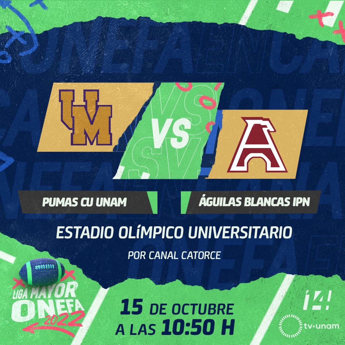 Otro evento deportivo que podrás disfrutar es el clásico de clásicos de la Liga Mayor de la Onefa, donde este sábado 15 de agosto se enfrentan los PUMAS de CU vs las Águilas Blancas del IPN, asiste en punto de las 12:00 horas al estado Olímpico Universitario o sintoniza la señal de Canal Catorce y se testigo del primer touchdown estudiantil.