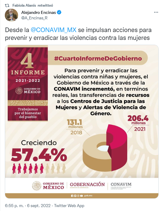 Por su parte, Alejandro Encinas, Subsecretario de Derechos humanos, Población y Migración, en el marco de la presentación del Cuarto Informe de Gobierno del presidente Andrés Manuel López Obrador, detalló que el Gobierno de México a través de la CONAVIM impulsa acciones para prevenir y erradicar las violencias contra las mujeres, ya que se incrementaron los recursos a los Centros de Justicia para las Mujeres y Alertas de Violencia de Género pues mientras que en 2018 se destinaron 131.1 millones de pesos (mdp) en el 2021 aumentó a un total de 206.4 mdp, esto representa un crecimiento del 57.4%.