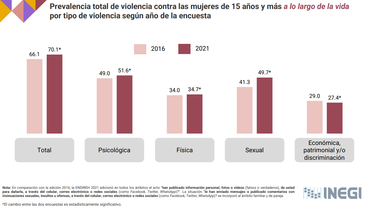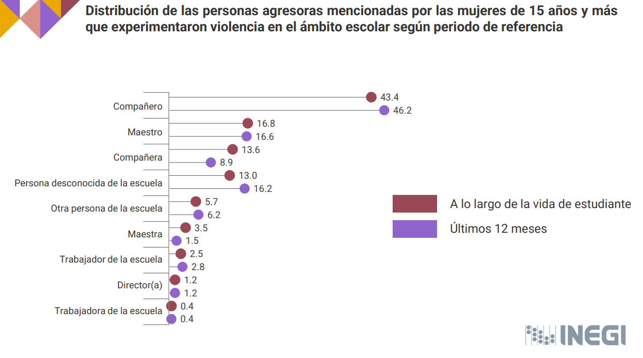 De acuerdo con la Encuesta Nacional sobre la Dinámica de las Relaciones en los Hogares (ENDIREH) 2021 realizada por el Instituto Nacional de Estadística y Geografía (INEGI), el 59% de las mujeres que han sufrido algún tipo de violencia de género lo han vivenciado en el ámbito escolar, específicamente a nivel media superior y superior, así lo informó Fabiola Alanís, titular de la Comisión Nacional para Prevenir y Erradicar la Violencia contra las Mujeres (CONAVIM), en la presentación del Informe mensual de la Estrategia Nacional de Protección Integral para las Mujeres del pasado 7 de septiembre del presente año.
