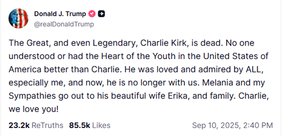 El gran, y hasta legendario, Charlie Kirk ha muerto. Nadie entendió ni tuvo el corazón de la juventud en Estados Unidos mejor que Charlie. Fue amado y admirado por TODOS, especialmente por mí, y ahora ya no está con nosotros. Melania y yo enviamos nuestras condolencias a su hermosa esposa Erika y a su familia. ¡Charlie, te amamos!