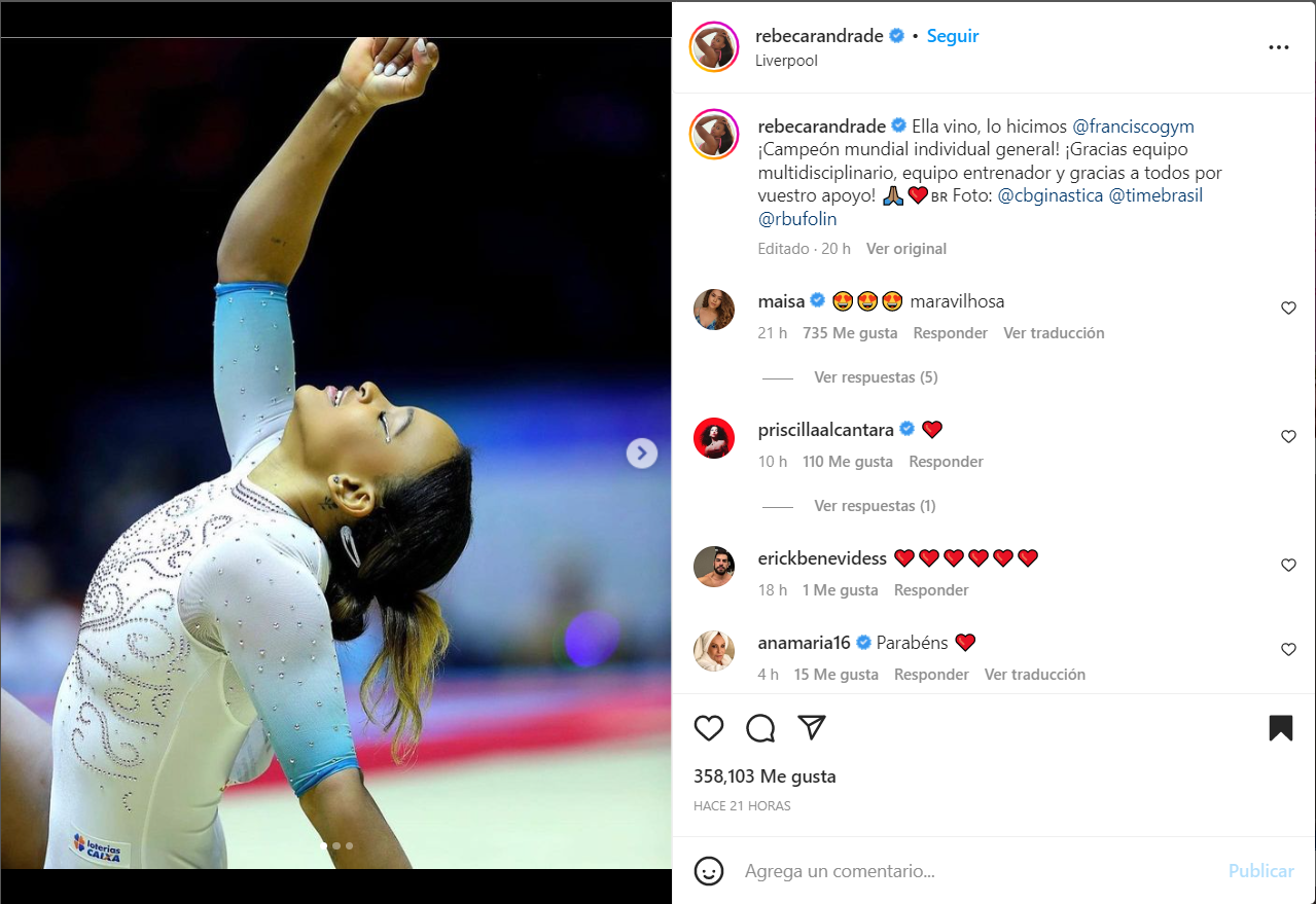 La gimnasta brasileña, Rebeca Andrade, se convirtió en la nueva campeona del mundo y en la primera atleta de Brasil y Sudamérica en obtener el primer lugar en gimnasia artística.