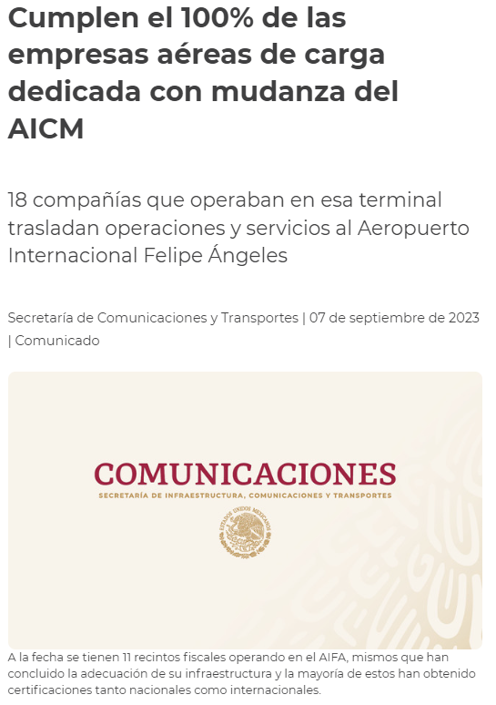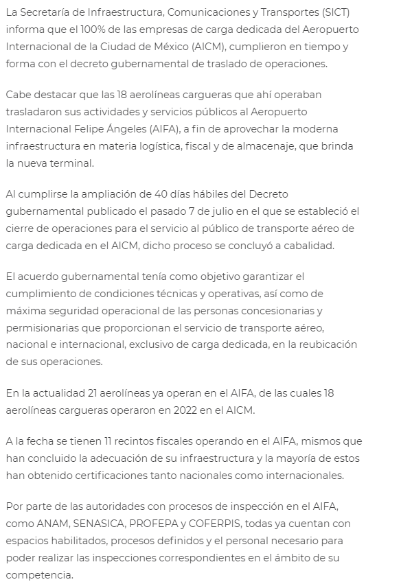 La Secretaría de Infraestructura, Comunicaciones y Transportes (SICT) informó que las 18 compañías cargueras que operaban en el Aeropuerto Internacional de la Ciudad de México (AICM) ya mudaron sus operaciones al Aeropuerto Internacional Felipe Ángeles (AIFA), cumpliendo con el decreto emitido por el Gobierno de México el pasado 7 de julio.