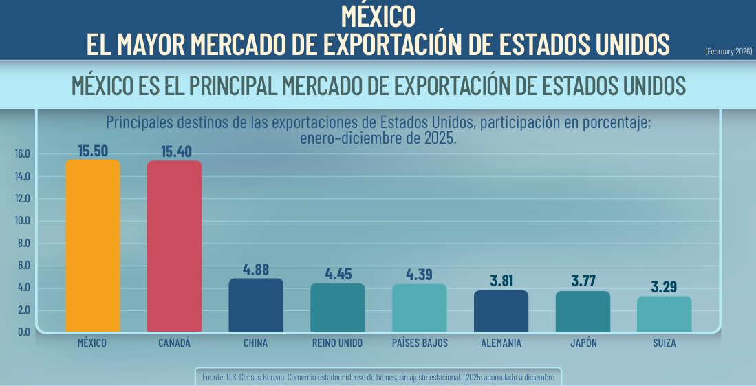 Al cuarto trimestre del 2025, 14.9% de las exportaciones de Estados Unidos tuvieron como destino México.