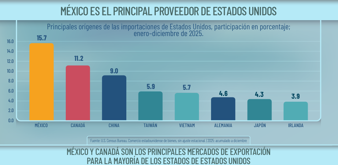 El informe presentado por la Oficina de Censo del Departamento de Comercio de Estados Unidos señala que México es el mercado más grande para las Unión Americana en 22 sectores, así como el primero o segundo más importante para el 75% de los sectores exportadores en 2025.