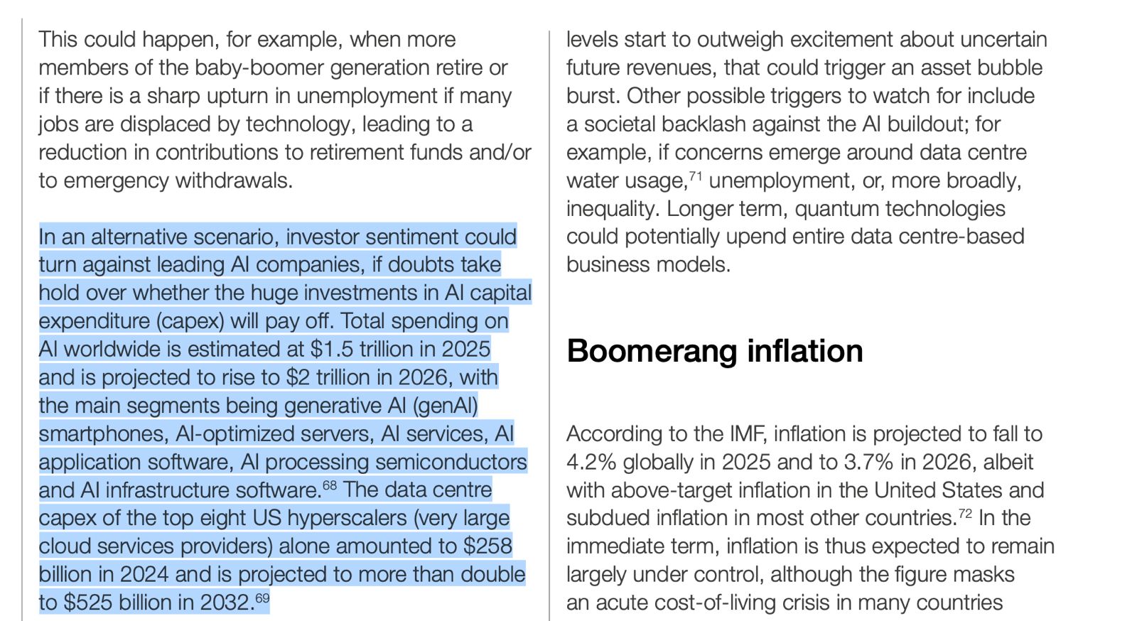 Si bien el WEF calcula que el tamaño del mercado global para la IA aumentará de unos 280 mil millones de dólares en 2024 a 3,5 billones de dólares en 2033, también advierte que el sentimiento de los inversores en la IA podría colapsar si no demuestran retornos rápidos. También plantea un escenario en el que si la deuda acumulada para financiar estos semiconductores y centros de datos pesa más que los ingresos reales, el mercado enfrentará una corrección violenta.