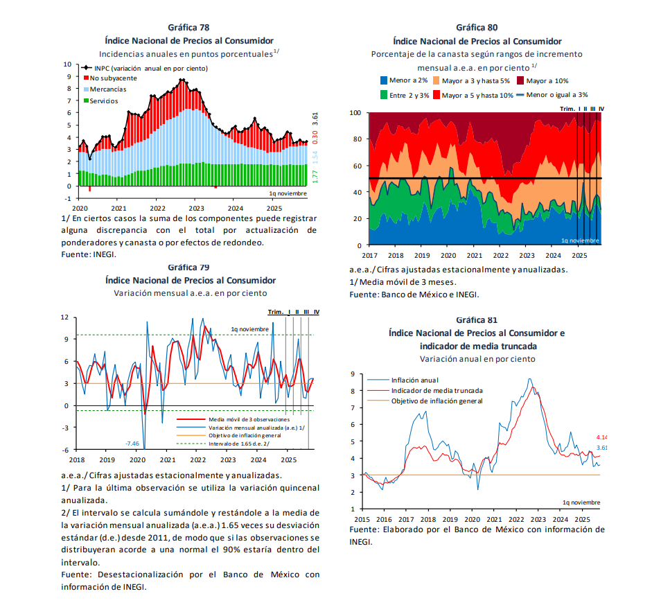 El Informe Trimestral incluye también un análisis sobre la estabilidad de la actividad económica y diversos indicadores de desempeño. Se recalca que, aunque el comportamiento de la inflación es positivo, su reducción anual es más lenta debido a los efectos aritméticos de choques previos.