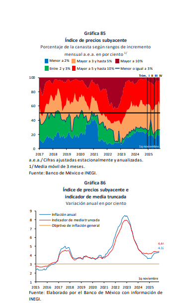 En contraste, la inflación subyacente, que refleja la tendencia de largo plazo y es el componente que más influye en la política monetaria, subió de 4.08% a 4.25% entre trimestres. El aumento está asociado al encarecimiento de mercancías, aunque la inflación de servicios mostró una ligera reducción.
