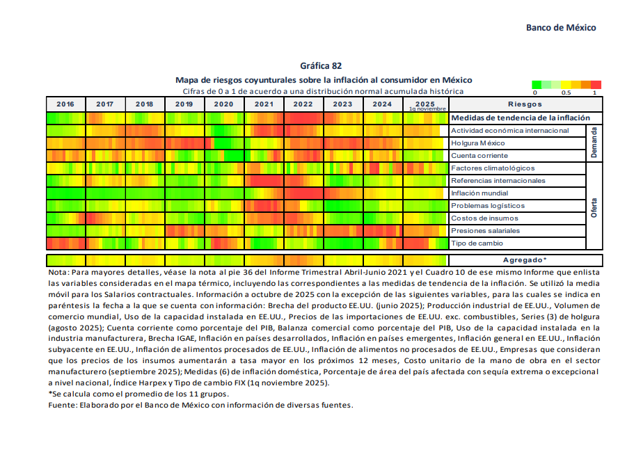 La inflación general anual descendió de 4.22% a 3.61% entre el segundo y el tercer trimestre de 2025, de acuerdo con el Informe Trimestral julio-septiembre 2025 del Banco de México (Banxico). El nivel de 3.61% también se registró en la primera quincena de noviembre, lo que consolida un entorno de menor presión inflacionaria, aún por debajo del aumento anual de 7.3% del salario diario asociado a los empleos afiliados al IMSS.