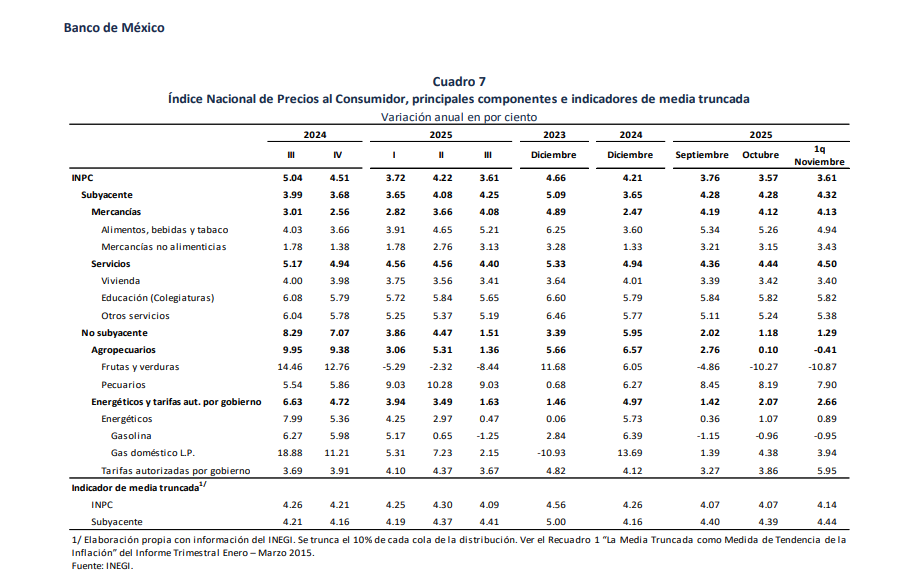 En la primera quincena de noviembre, la inflación subyacente se ubicó en 4.32%, mientras que la no subyacente bajó a 1.29%.