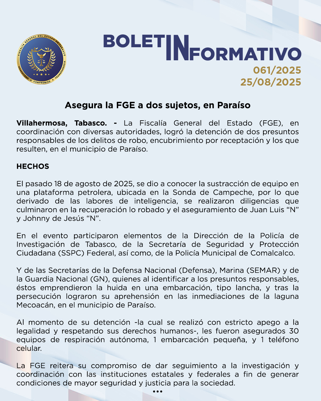 La Fiscalía General del Estado (FGE) de Tabasco informó que, en coordinación con autoridades federales, estatales y municipales, aseguró a dos sujetos identificados como Juan Luis “N” y Johnny de Jesús “N”, señalados como probables responsables de los delitos de robo y encubrimiento por receptación, en hechos ocurridos en el municipio de Paraíso.