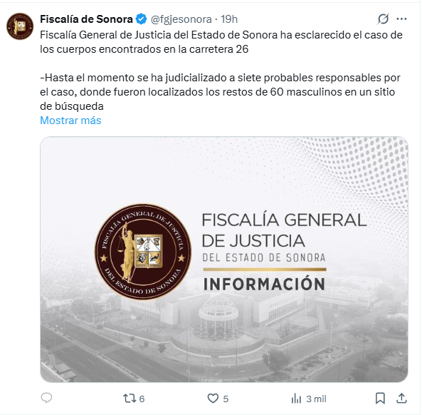 Con respecto a la información difundida por un noticiero local, basada en datos proporcionados por un colectivo de madres buscadoras sobre la identificación de los 60 cuerpos localizados en la carretera 26 entre finales de enero y principios de febrero en la zona rural poniente de Hermosillo, la Fiscalía General de Justicia del Estado de Sonora (FGJES) señaló: