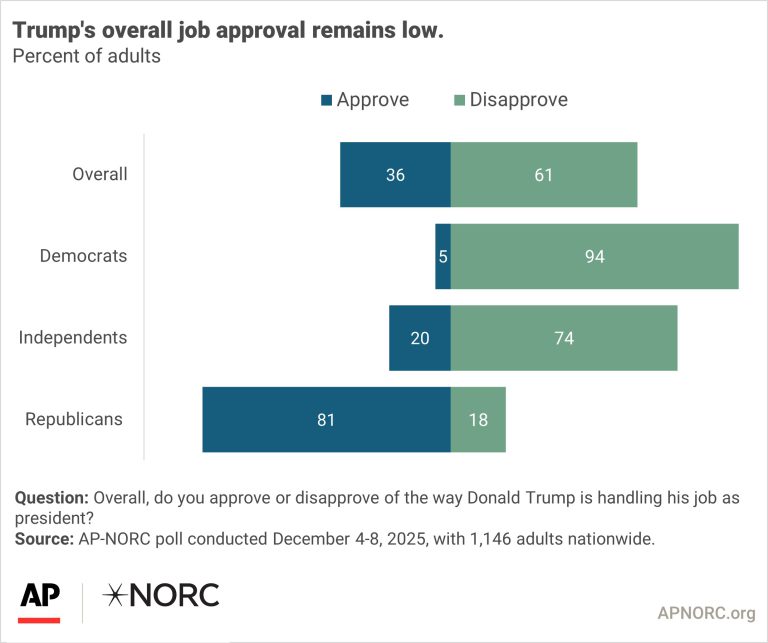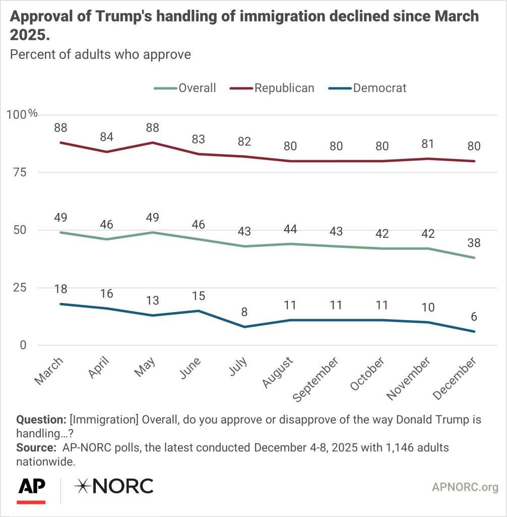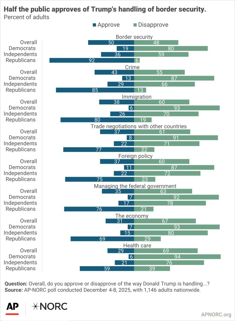 A poco de cumplir su primer año en el segundo mandato, el 20 de enero de 2026, el presidente de Estados Unidos, Donald Trump, ha perdido apoyo en temas como economía y migración, con una caída de alrededor de 10 puntos desde marzo. La seguridad fronteriza se mantiene como su rubro mejor evaluado, con 50% de aprobación. Esto según encuestas de Associated Press y el Centro Nacional de Investigación de Opinión (NORC) de la Universidad de Chicago, publicadas el 11 de diciembre de 2025.