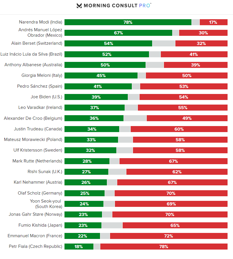 Después le sigue Lula da Silva de Brasil (52%), Anthony Albanese de Australia (50%), Giorgia Meloni de Italia (45%), Pedro Sánchez de España (41%), Joe Biden (39%), Leo Varadkar de Irlanda (37%), Alexander de Croo de Bélgica (36%), Justin Trudeau de Canadá (34%), Mateusz Morewiecki de Polonia (33%), Ulf Kristersson de Suecia (32%), Mark Rutte de Países Bajos (28%), Rishi Sunat del Reino Unido (28%), Karl Nehammer de Austria (26%), Olaf Scholz de Alemania (25%), Jonas Gahr Store de Noruega (23%), Fumio Kishida de Japón (23%), Emmanuel Macron de Francia (22%), y Petr Fiala de la República Checa (20%).