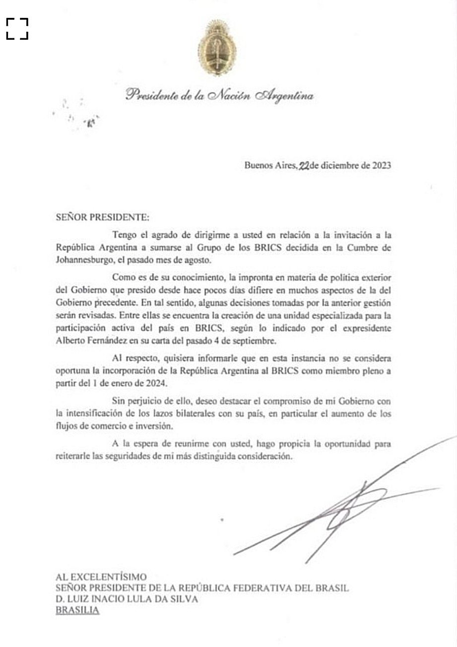 Durante la campaña presidencial, Milei había manifestado su rechazo a que Argentina formara parte de los BRICS debido a que desde entonces planeaba romper lazos con Brasil y China.
