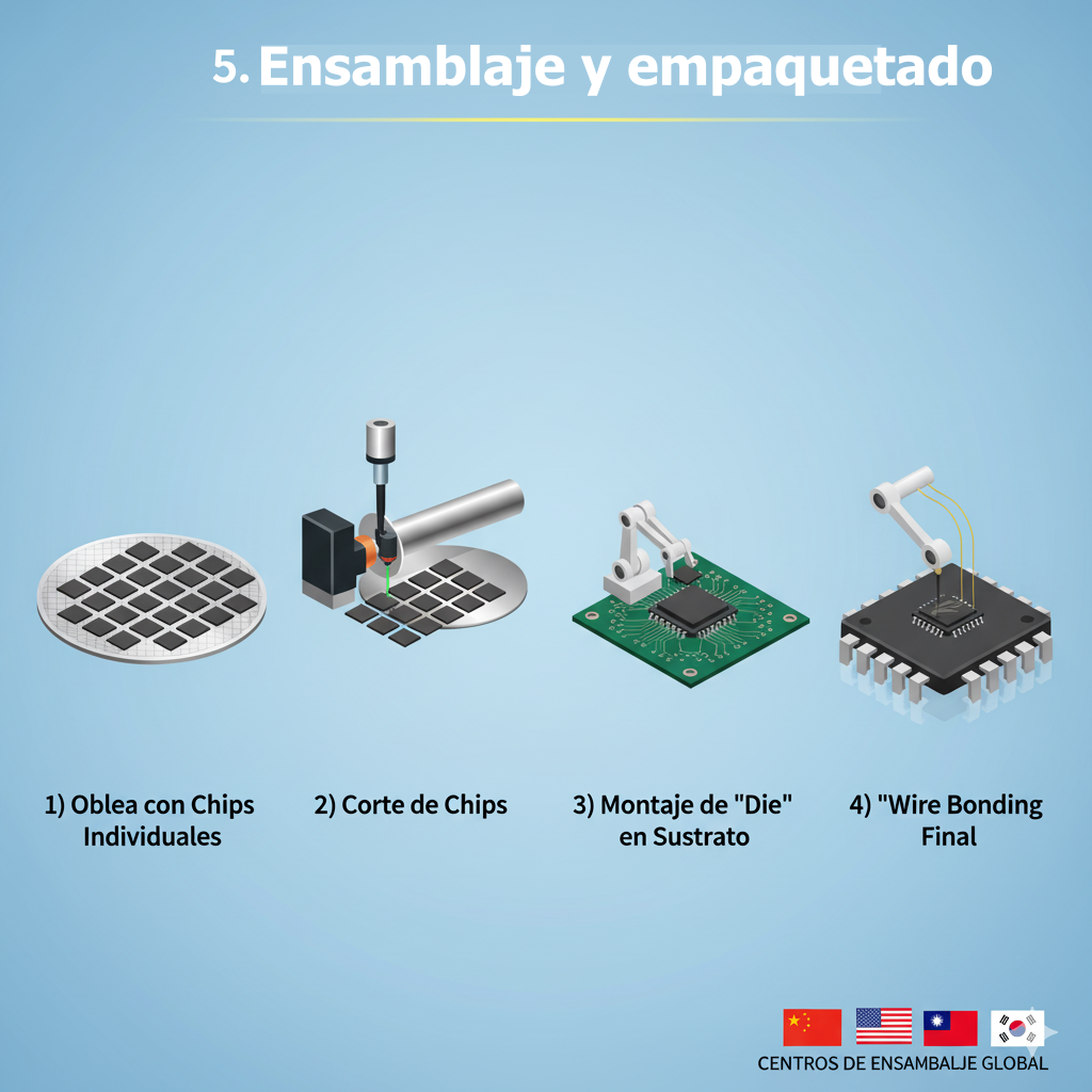 La oblea terminada se corta, y cada chip individual se monta en un sustrato, se conecta con cables de oro y se encapsula en el plástico negro. Las empresa líderes de ensamblaje están principalmente en China, Taiwán, Malasia y Vietnam.