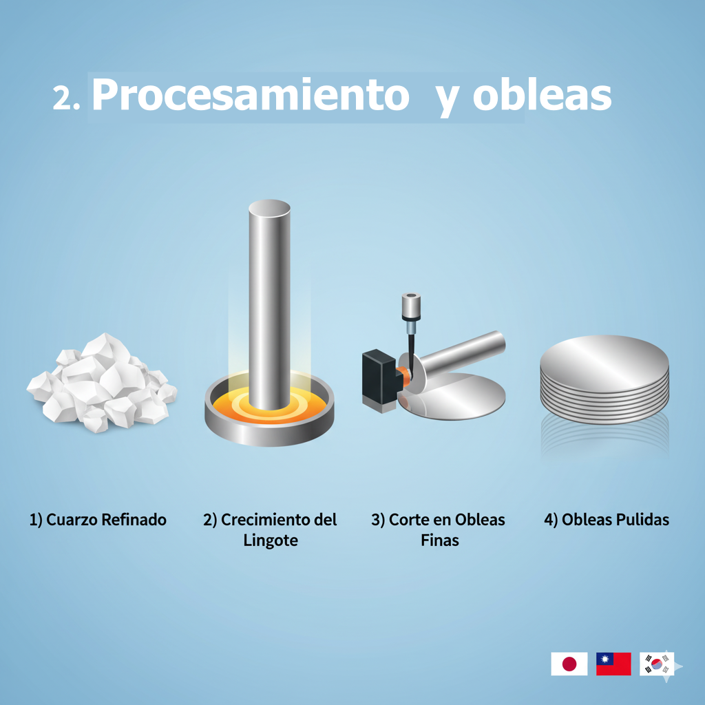 El silicio purificado se funde y se "cultiva" en lingotes cilíndricos, que luego se cortan en discos perfectos llamados "obleas" o wafers. Esta es la base sobre la que se construyen miles de chips. Este proceso es liderado por empresas japonesas como Shin-Etsu y SUMCO, o la taiwanesa GlobalWafers.