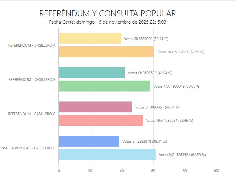 Con el 80 % de las actas validadas, el Consejo Nacional Electoral (CNE) confirmó que el ‘No’ se impone en las cuatro preguntas del referéndum celebrado este domingo 16 de noviembre, en una jornada donde participaron cerca del 80 % de los 13,9 millones de electores convocados.