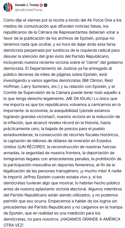 A través de su red social, Trump aseguró que los republicanos deben respaldar la divulgación “porque no tenemos nada que ocultar”. El cambio es notable, especialmente ante la posibilidad de que decenas de legisladores republicanos voten a favor de la medida esta semana.