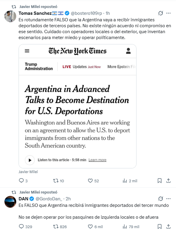 Milei reposteó en tres ocasiones, el 30 de enero, en la red social X, un mensaje de un usuario que asegura que “es falso que Argentina recibirá migrantes deportados del tercer mundo”.