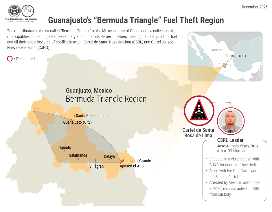 Este 17 de diciembre el a Oficina de Control de Activos Extranjeros (OFAC) del Departamento del Tesoro de los Estados Unidos sancionó al Cártel de Santa Rosa de Lima, ya que, dijo que obtiene la gran mayoría de sus ingresos ilícitos del robo de combustible y petróleo en el estado mexicano de Guanajuato.