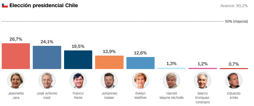 De acuerdo con los resultados preliminares del Servicio Electoral de Chile (Servel), con el 71.16 % de las mesas escrutadas, la oficialista Jeannette Jara obtuvo el 26.67% de los votos, mientras que Kast logró el 24.19 %. En tercer lugar, con el 19.22%, sorprendió el candidato Franco Parisi, del Partido de la Gente.