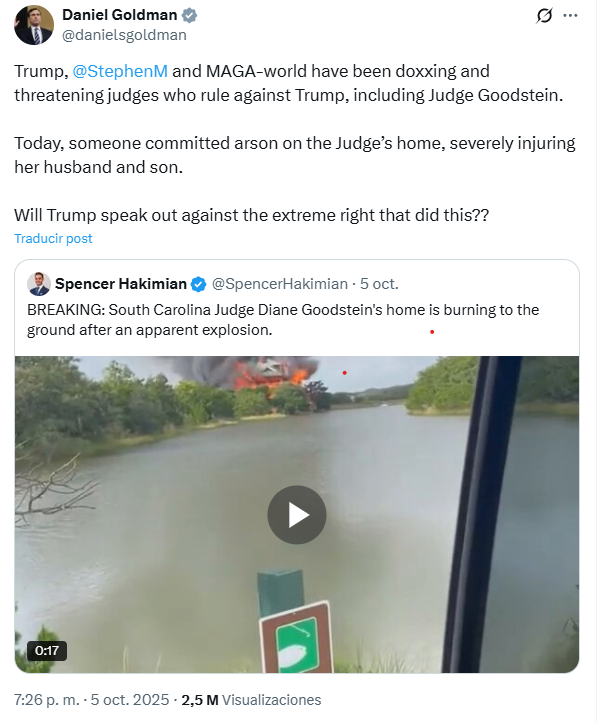 “Trump, @StephenM (Stephen Miller) y el mundo MAGA han estado doxeando (exponiendo) y amenazando a jueces que fallan en contra de Trump, incluida la jueza Goodstein. Hoy, alguien cometió un incendio en la casa de la jueza, hiriendo gravemente a su esposo e hijo. ¿Trump condenará a la extrema derecha que hizo esto?”