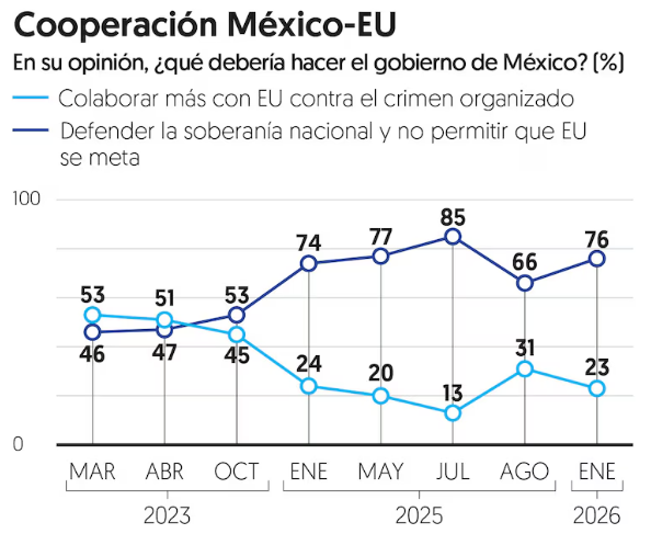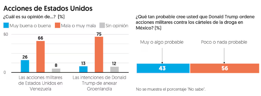 Asimismo, el 76 % considera que México debe defender su soberanía frente a las amenazas de injerencia por parte de Estados Unidos. El 66 % reprobó la operación militar unilateral de Estados Unidos en Venezuela, ocurrida el pasado 3 de enero, y el 75 % desaprueba los intentos injerencistas de la administración republicana respecto a Groenlandia.