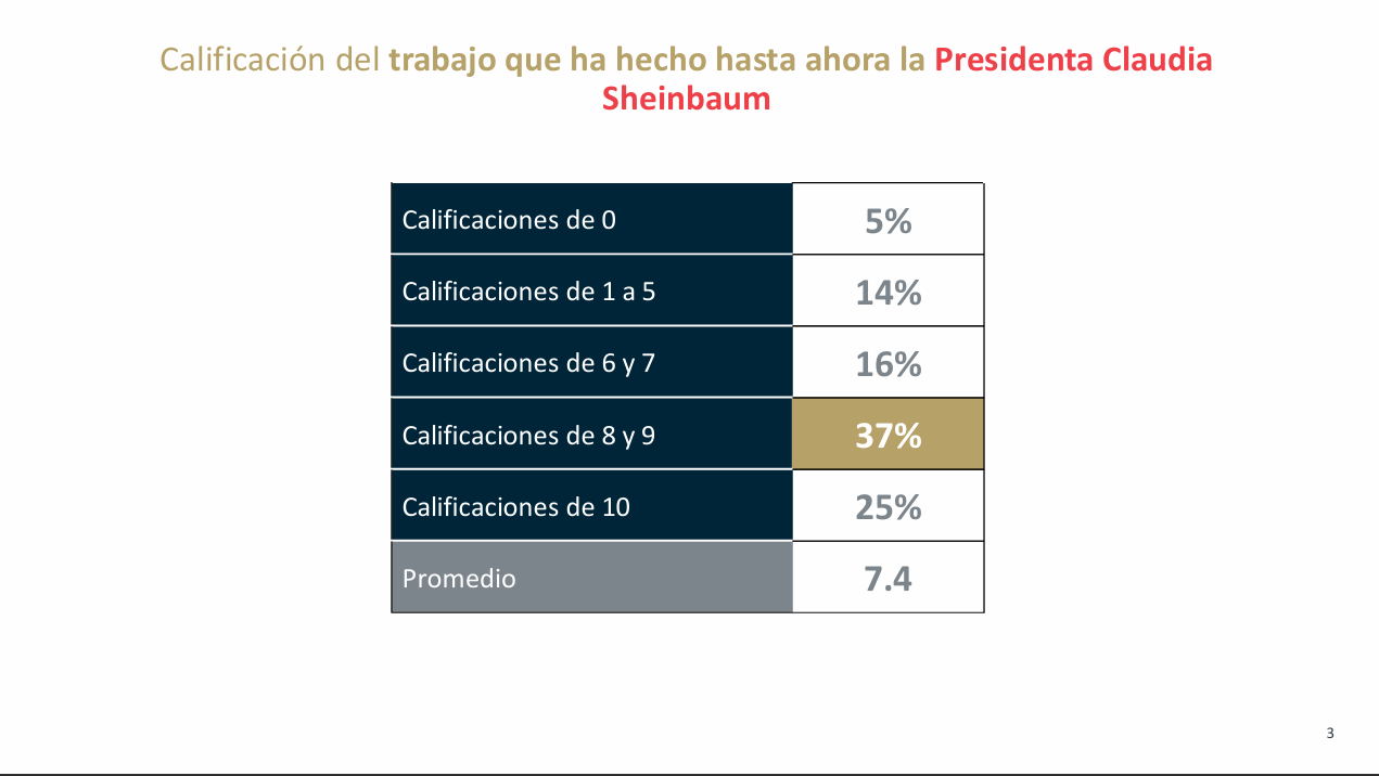 Finalmente, en cuanto al desempeño de la presidenta, 37% de los mexicanos calificó la gestión de la mandataria con 8 y 9, en tanto que 25% le otorgó una calificación de 10. En contraste, 16% la evaluó con 6 y 7, lo que arroja una calificación promedio de 7.4.