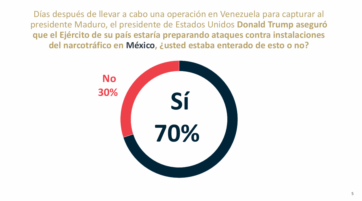 Tras los dichos de Donald Trump, quien aseguró que el Ejército estadounidense estaría preparando ataques contra instalaciones del narcotráfico en México, 70% de los encuestados afirmó estar enterado del tema, mientras que 30% dijo no tener información al respecto.