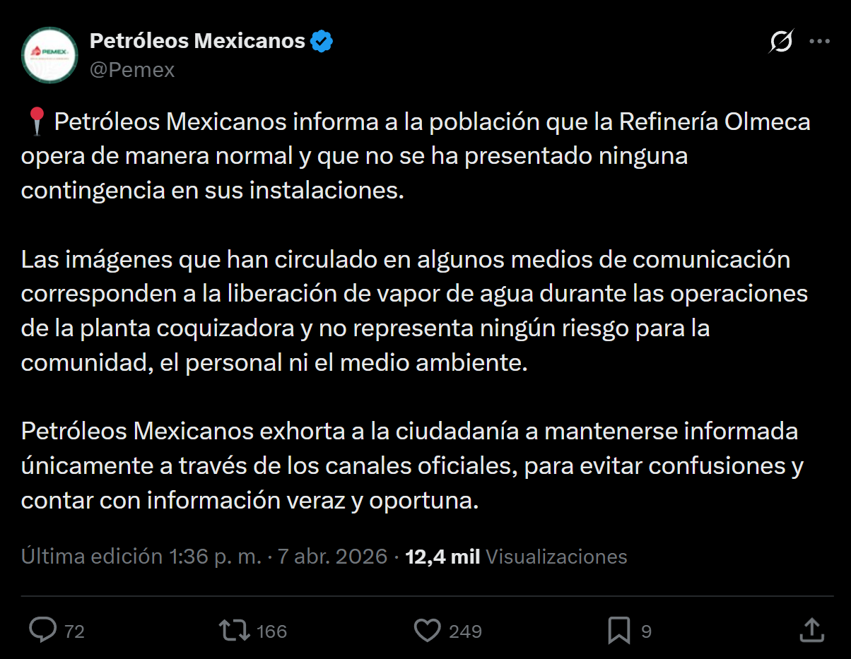 “Las imágenes que han circulado corresponden a la liberación de vapor de agua durante las operaciones de la planta coquizadora. Esto no  representa ningún riesgo para la comunidad, el personal ni el medio ambiente”, señaló la paraestatal.