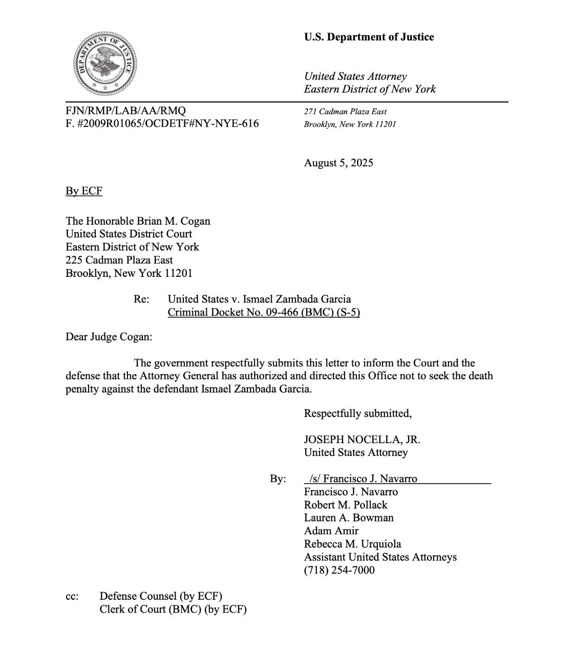 La decisión fue notificada en cartas oficiales enviadas a los jueces federales encargados de cada caso en la Corte del Distrito Este de Nueva York. En el caso de Zambada, el fiscal Joseph Nocella Jr. dirigió una misiva al juez Brian M. Cogan, en la que informó que la fiscal general de Estados Unidos autorizó no solicitar la pena capital. “La Fiscalía General ha determinado no buscar la pena de muerte en contra del acusado Ismael Zambada García”, señala el documento.